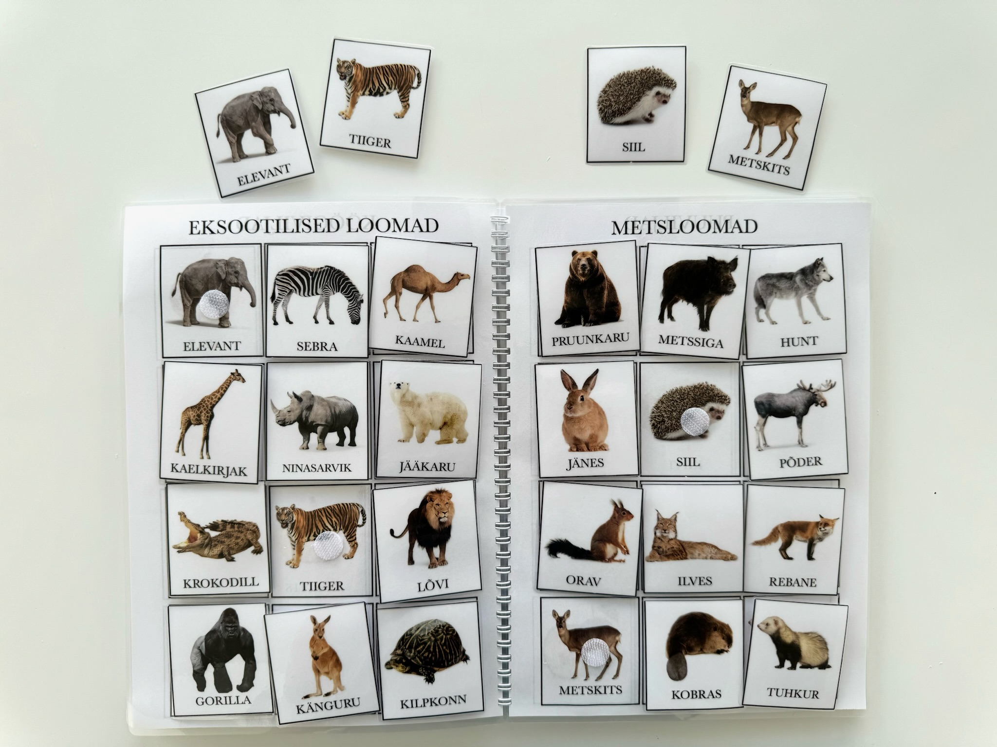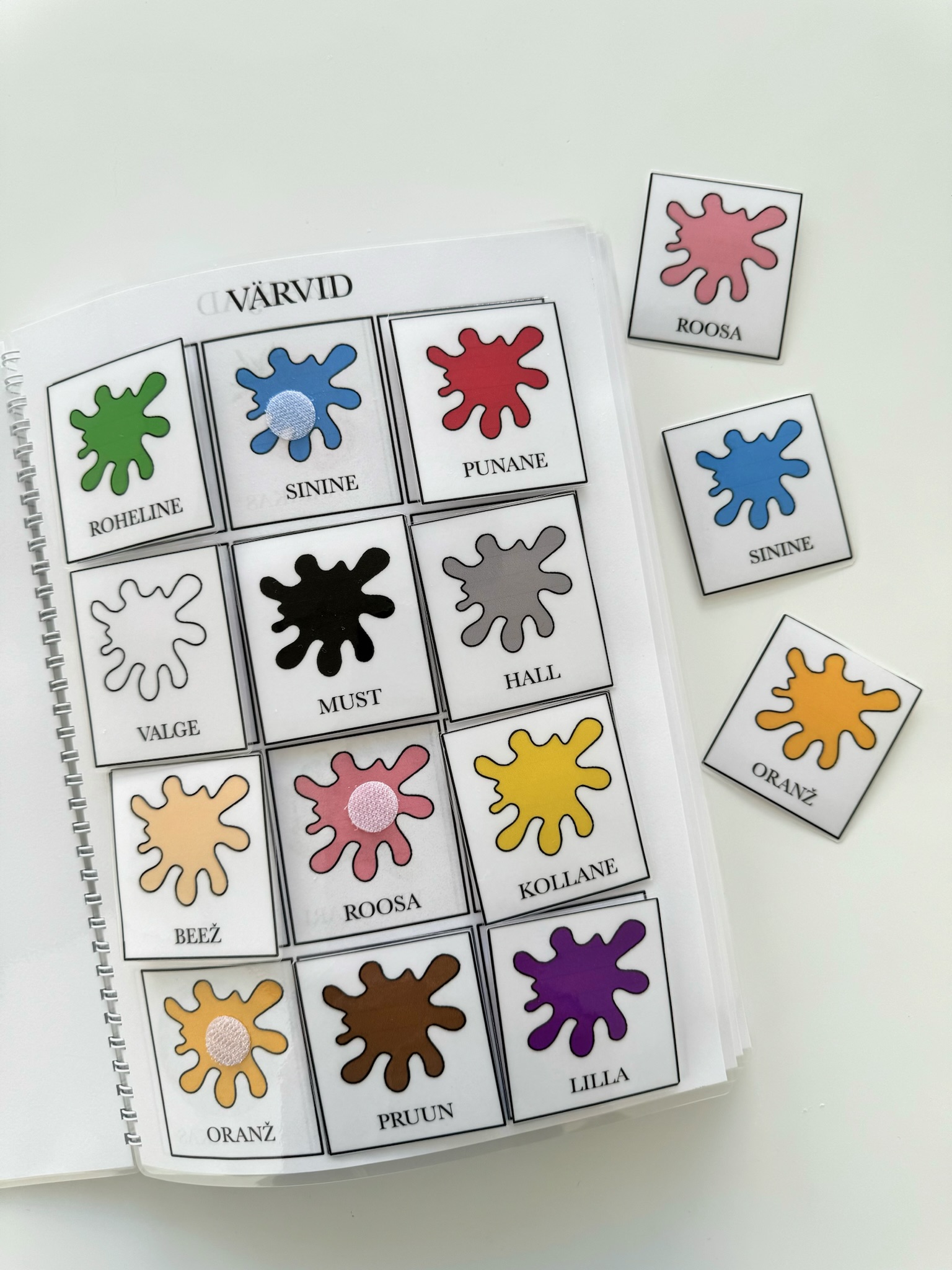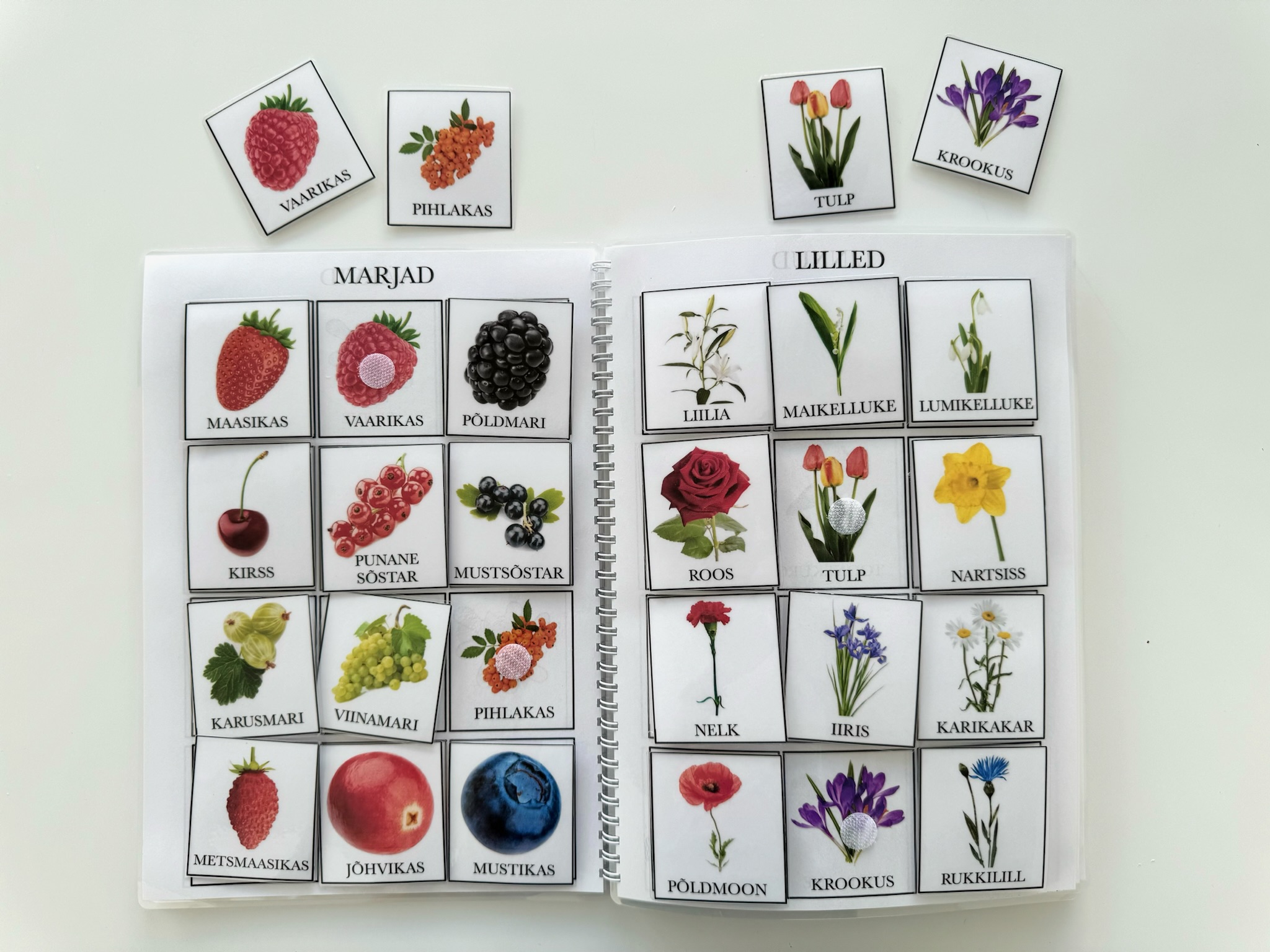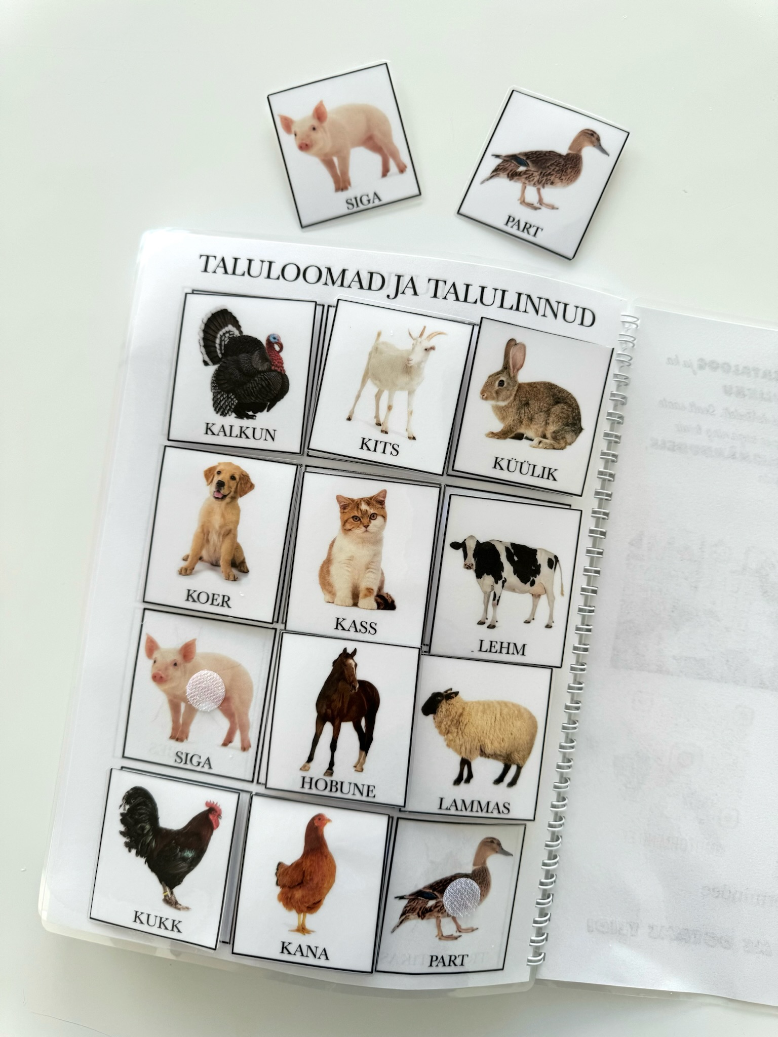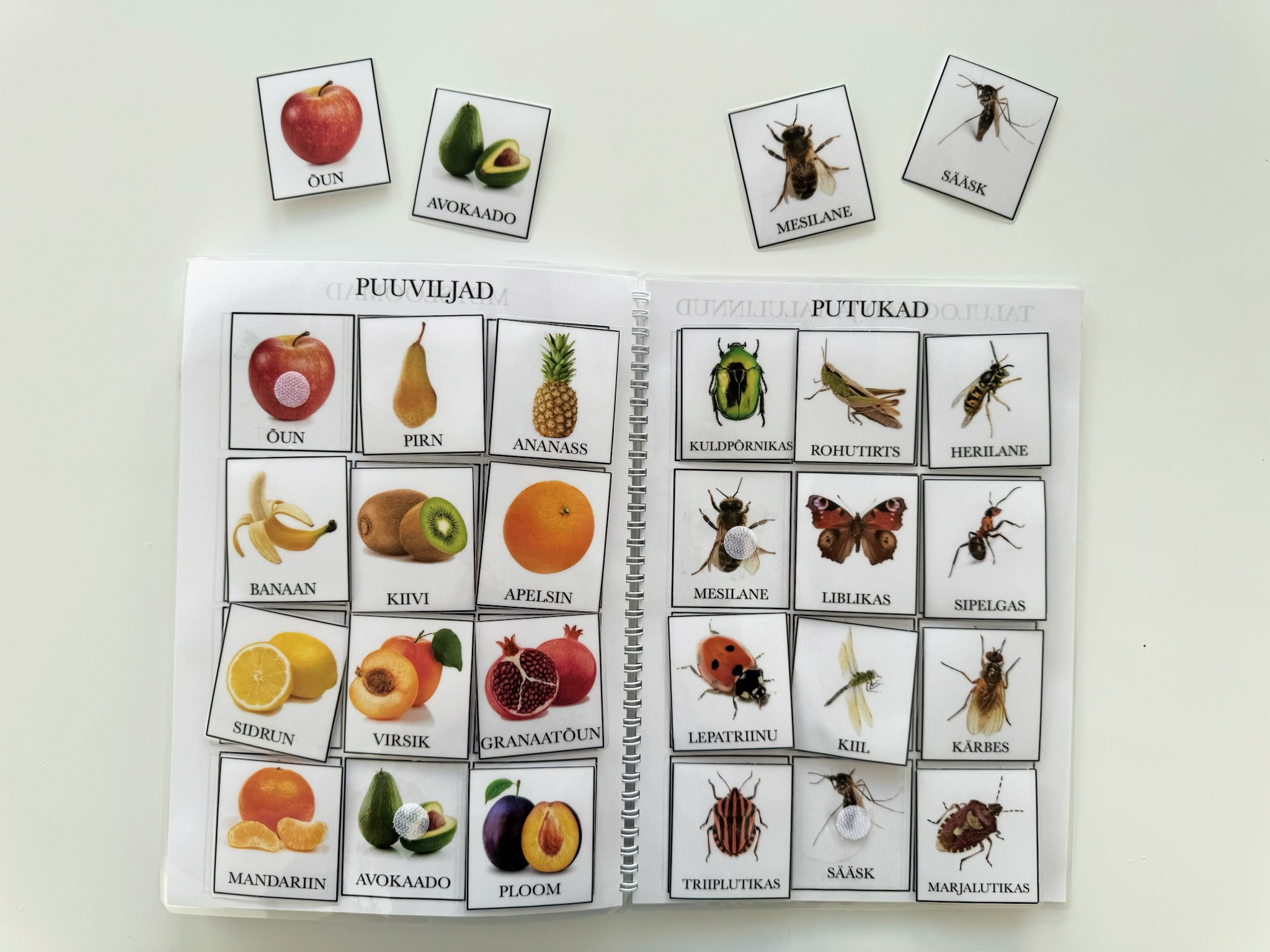 Raamatus on ülesanded takjakinnitustega, kus laps õpib seostama pilte vastavate nimetustega. Kõik