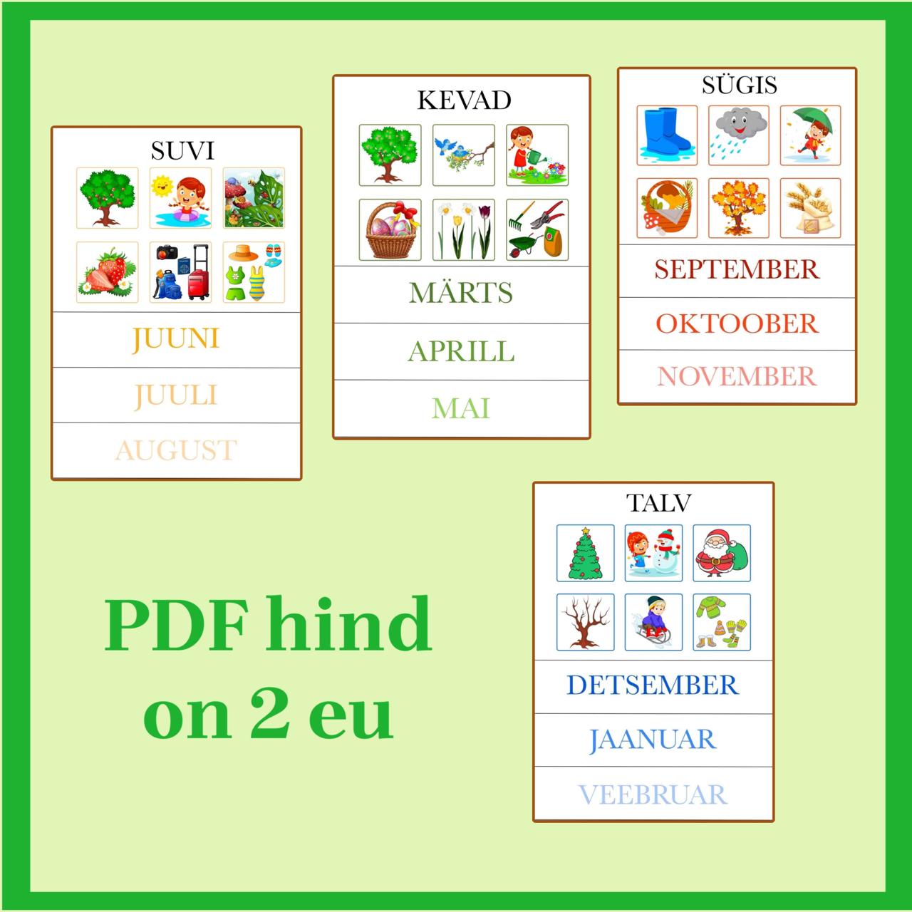 Komplektis on nii terved töölehed kui ka eraldi kaardid, mida saab välja lõigata ja õigesse kohta paigutada. Laps saab täita tühjad väljad, panna pildid õigesse aastaaega ja korrata kuude nimetusi.